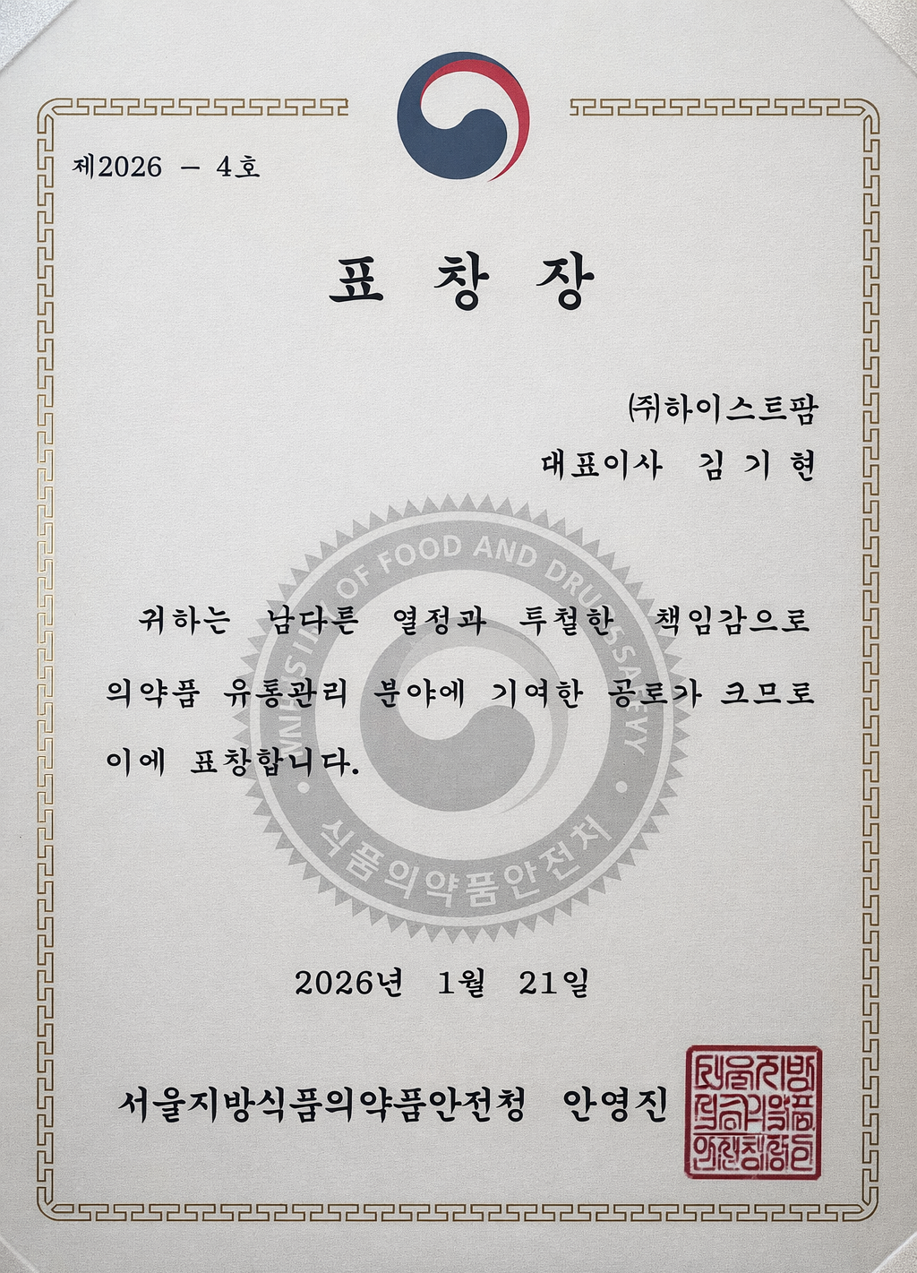 한편 하이스트팜은 의약품의 안정적 공급과 유통 질서 확립, 관련 법규 준수 및 투명한 유통 구조 정착에 기여한 공로를 인정받아 서울지방식품의약품안전청 표창을 수상했다.